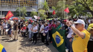 Alguns manifestantes também portavam bandeiras do Brasil e usavam bonés azuis com a frase “O Brasil é dos Brasileiros”, iguais aos usados pelo presidente Luiz Inácio Lula da Silva (PT) e seus ministros para confrontar Trump.